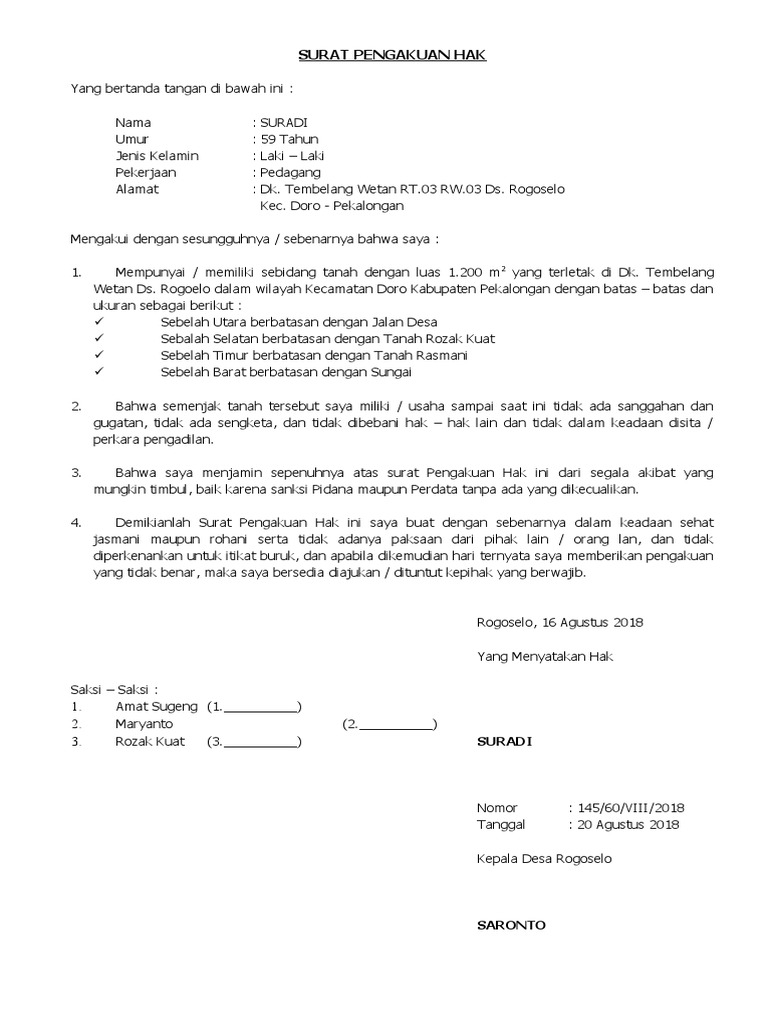 Yang pertama adalah pengalihan itu harus berdasarkan sesuatu yang jelas. Saya yang bertanda tangan di. Contoh surat pengakuan hak atas tanah surat pengakuan hak atas tanah saya yang bertanda tangan dibawah ini : 03/07/2019 · gambar contoh surat pernyataan hak milik tanah terlengkap 2019.